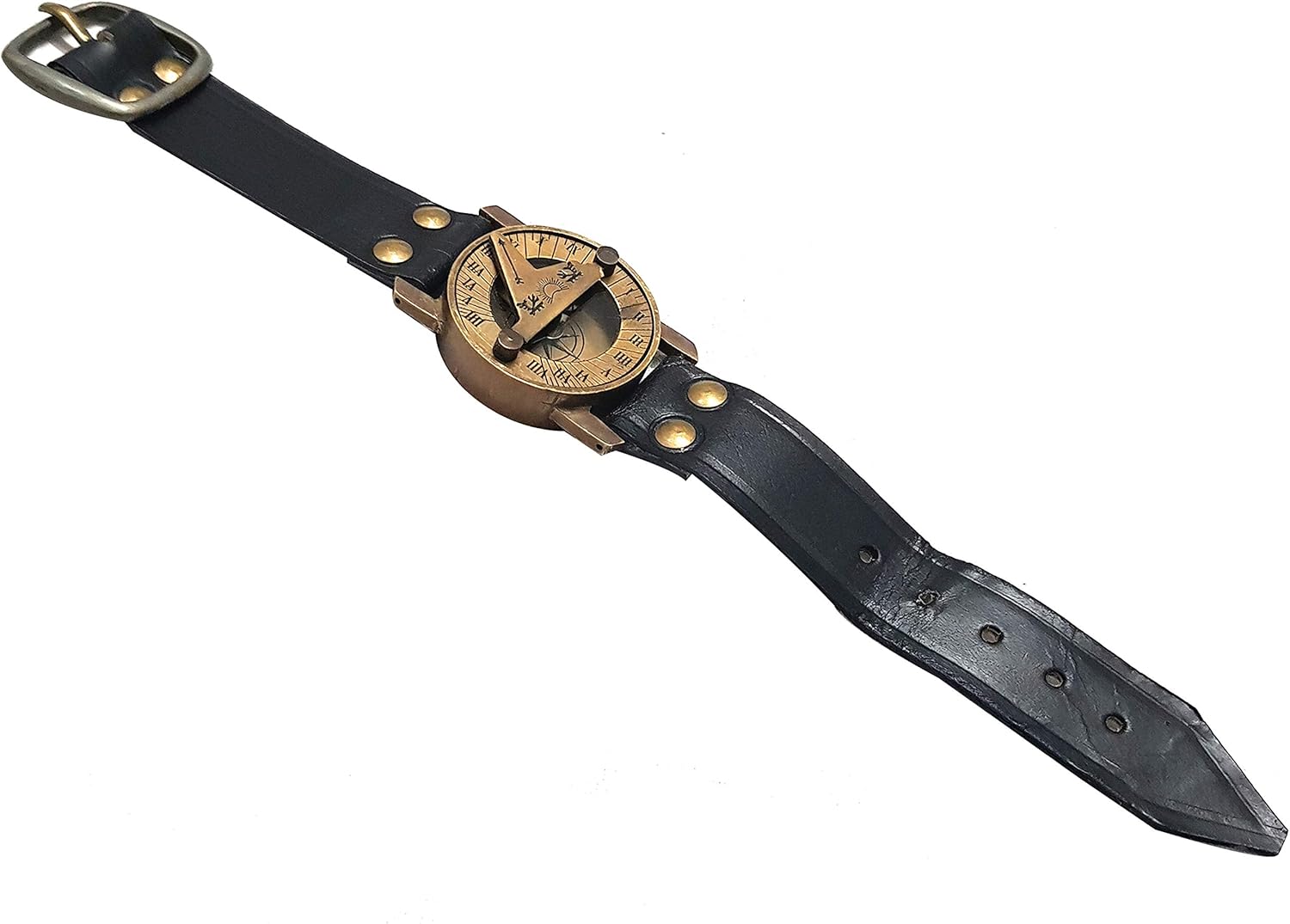 - Hecho de latón macizo y acabado de latón envejecido con una correa de cuero negro resistente.