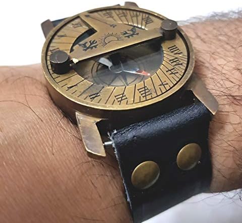 Acerca de este producto Esfera solar: aprox. 6,35 cm de diámetro x 1,9 cm de ancho. Banda: aprox. 13 pulgadas de largo (hebilla a punta) x 1.25 pulgadas (ancho). Hecho de latón macizo y acabado de latón envejecido con una correa de cuero negro resistente. Pieza vintage de la vieja escuela. Es un reloj solar, buscador de latitud y brújula, todo enrollado en uno. Hermosa pieza de tiempo steampunk, utilizando solo el sol Una navegación perfecta coleccionable por Antique Decor